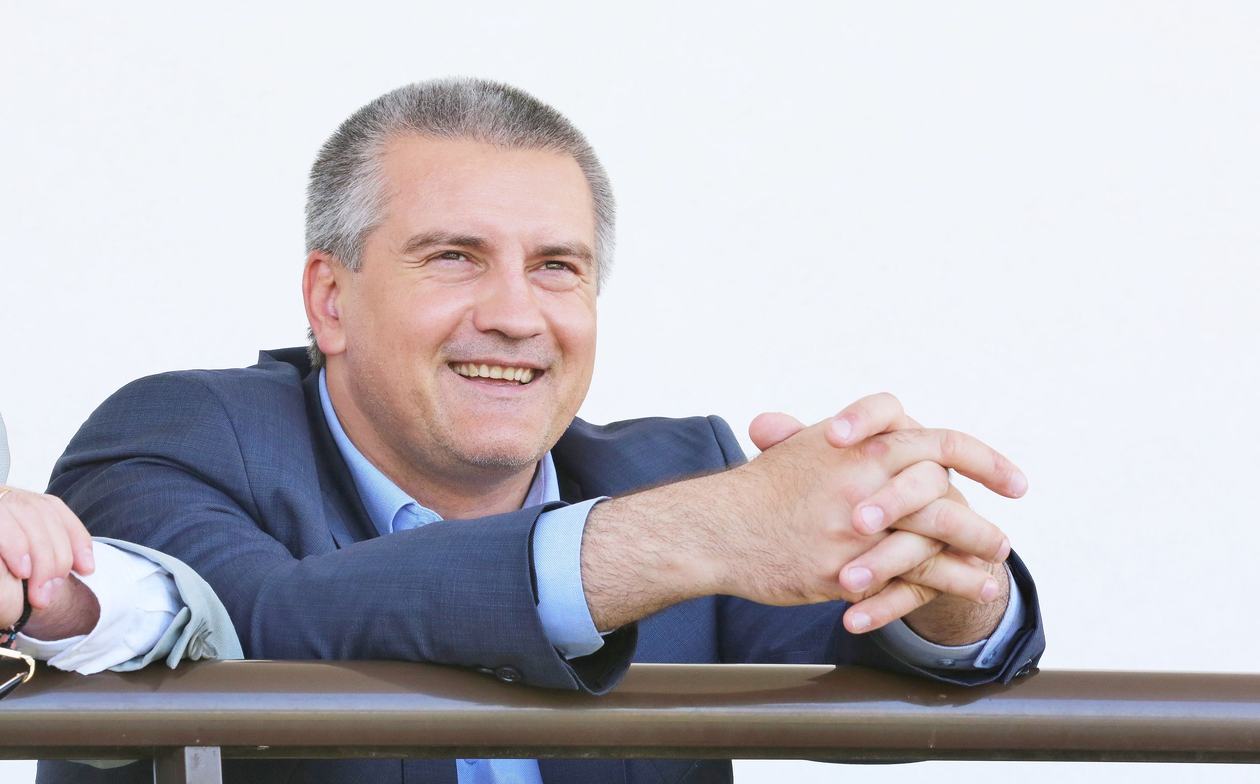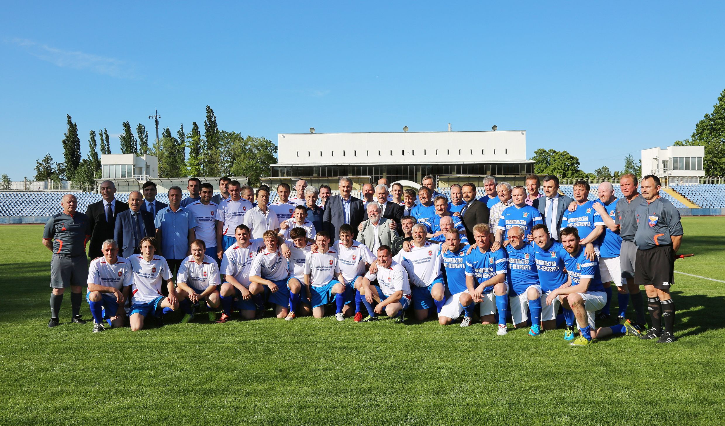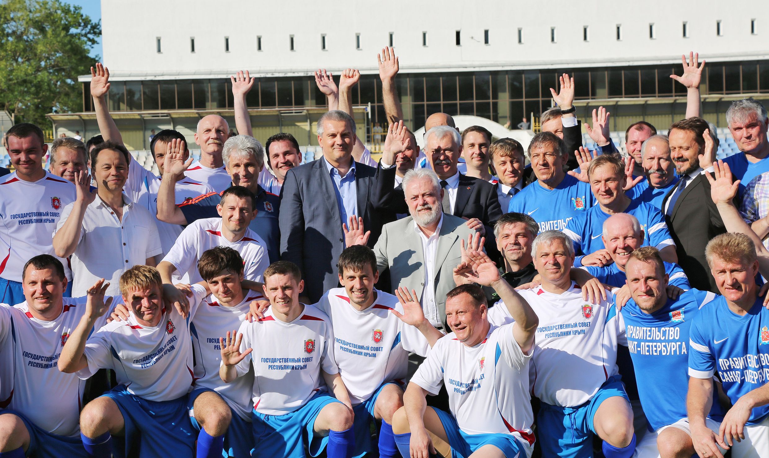 Глава Республики Крым Сергей Аксёнов и губернатор Санкт-Петербурга Георгий Полтавченко посмотрели с трибуны товарищеский матч по футболу между сборной Правительства Санкт-Петербурга и сборной Совета министров Республики Крым, который прошёл на стадионе «Локомотив».